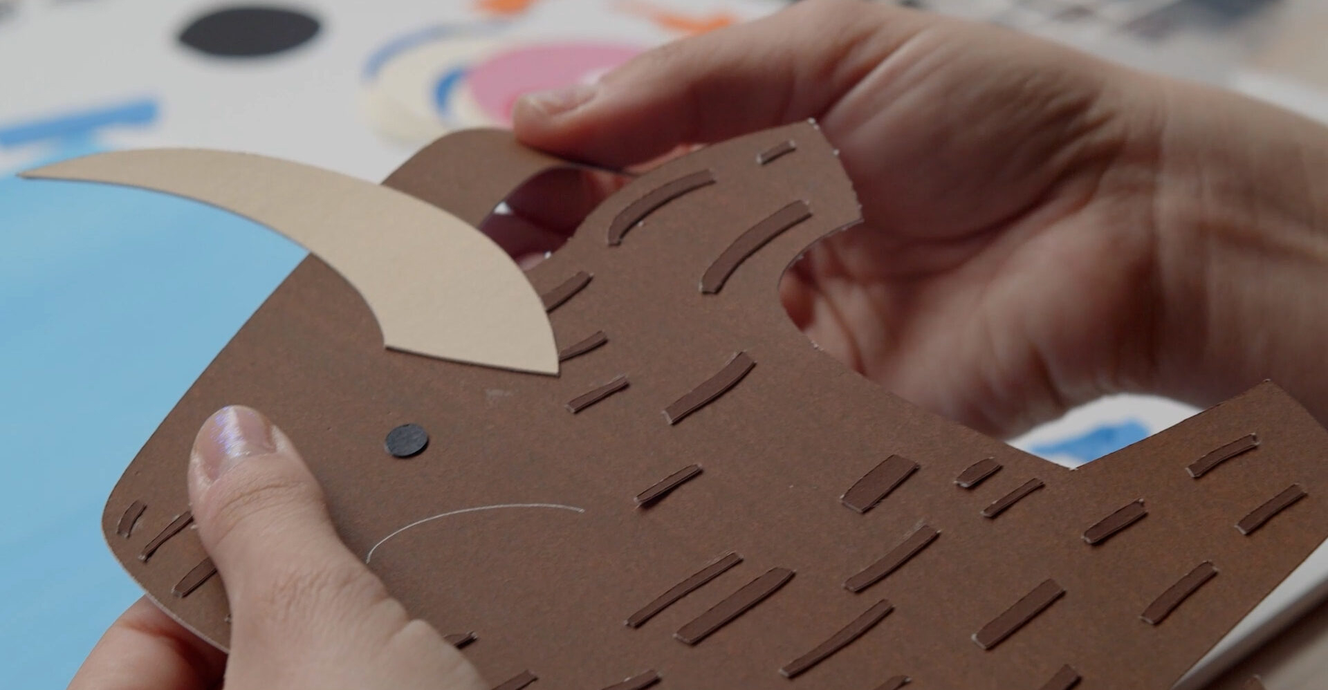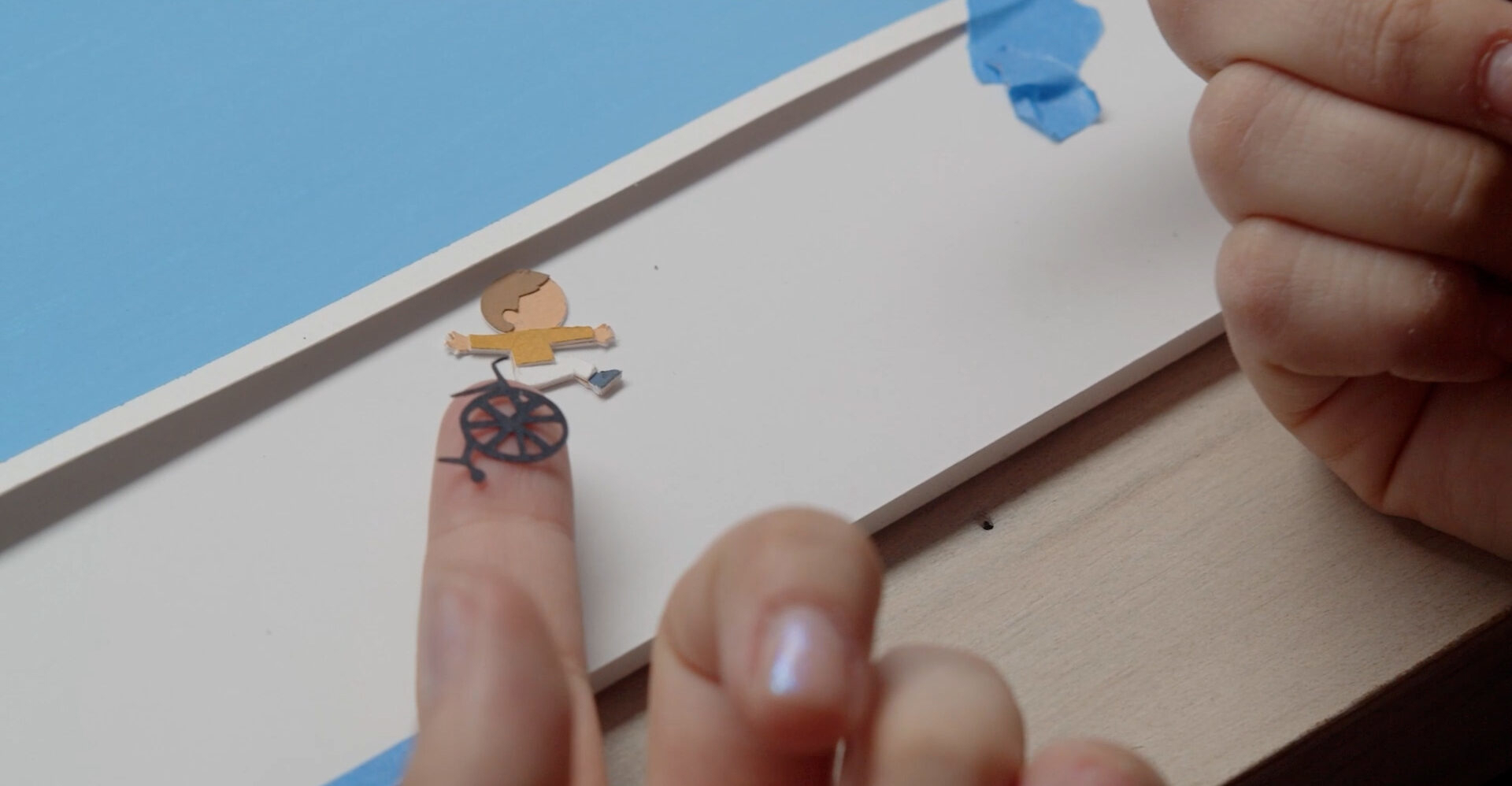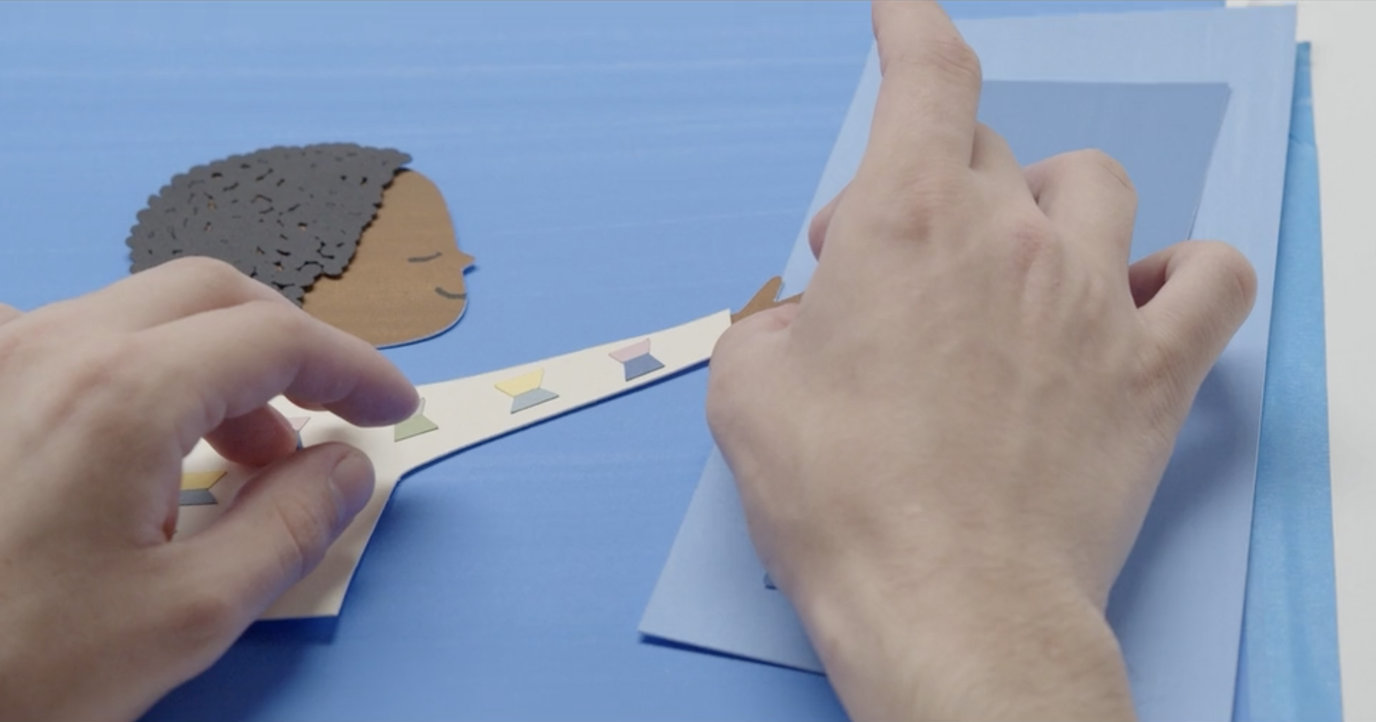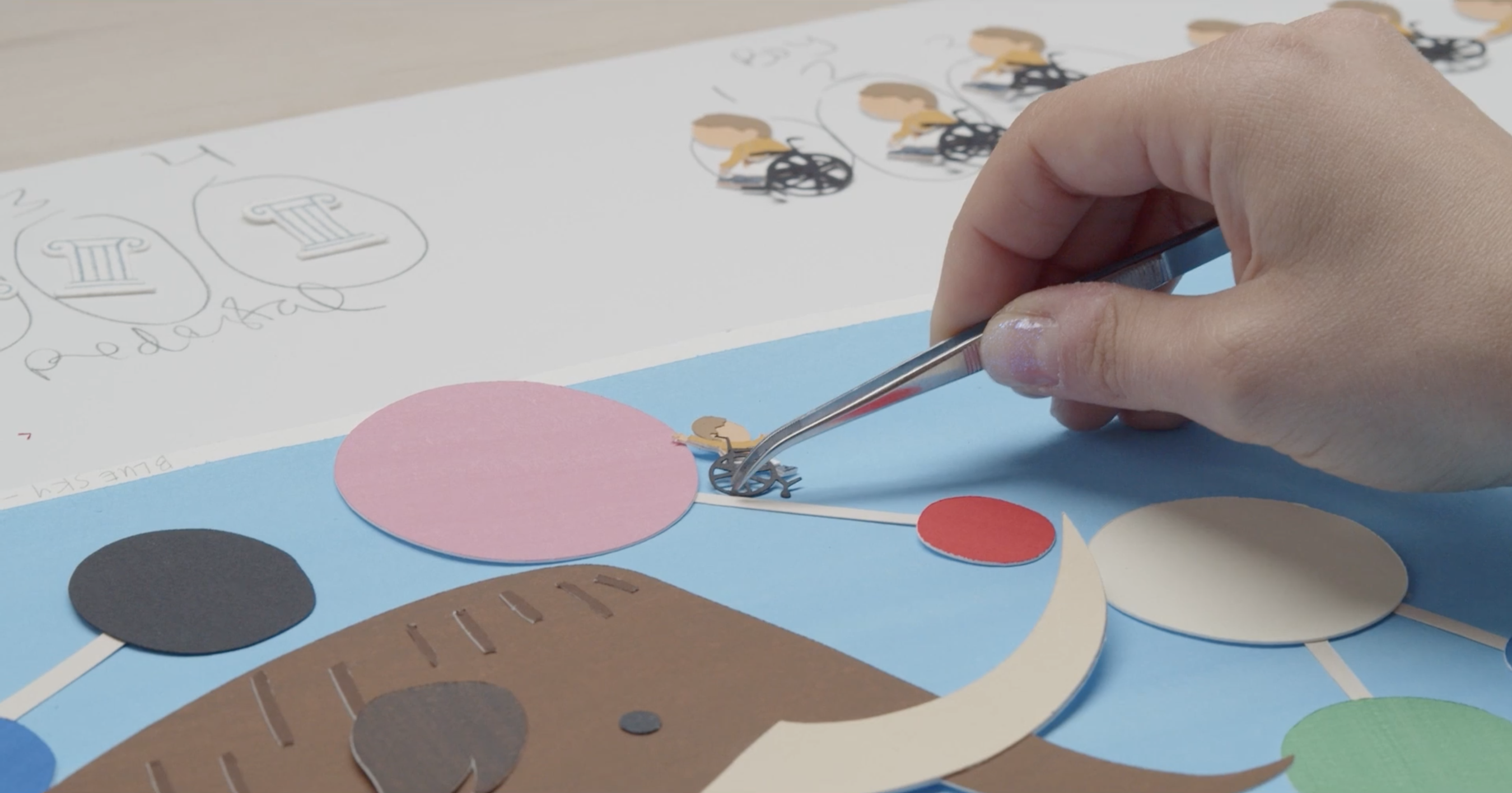 Lucinda created an aesthetic that was strongly informed by Christian’s art, who works by painting sheets of paper, then cutting and collaging these together. She created digital versions and then recreated each frame using hand painted paper and a vector cutter. These frames were then shot in sequence, in camera to create the final animation.